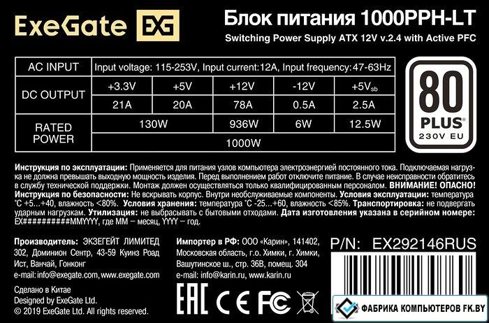 Блок питания ExeGate 1000PPH-LT 80 Plus EX292146RUS-OEM