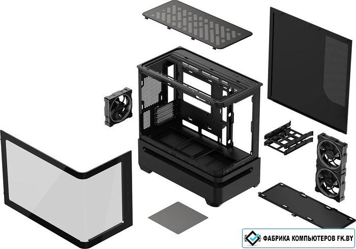 Mini Tower, БП отсутствует, для плат micro-ATX/mini-ITX, с 3 вентиляторами в комплекте, окно: закаленное стекло, видеокарта до 420 мм, охлаждение ЦП до 175 мм, пылевой фильтр - сверху/снизу, 2xUSB-A 3.2 5Гбит/с, 1xUSB-C 2x2 20Гбит/с, цвет черный