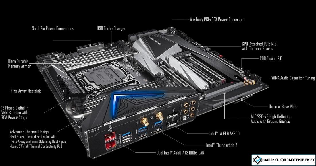 eATX, сокет Intel LGA2066, чипсет Intel X299, память 8xDDR4, слоты: 4xPCIe x16, 3xM.2