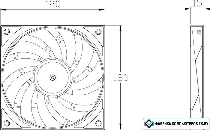 высота 15 мм, вентилятор 120 мм, прямое направление потока, 1900 об/мин, PWM, подшипник гидродинамический (FDB), ARGB подсветка, макс. шум 28.4 дБ
